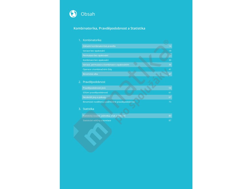 Pracovní sešit je určen pro studenty 4. ročníku středních škol a je úzce provázán s učebnicí Kombinatorika, Pravděpodobnost a Statistika. Učebnice vám poskytuje všechny potřebné výklady a postupy, díky kterým budete schopni řešit příklady v pracovním sešitu. Příklady jsou řazeny vzestupně podle náročnosti. Máte tak jedinečnou možnost zlepšovat se a mapovat svůj postup zároveň s postupem v pracovním sešitu. Každá kapitola obsahuje krátké výpisky, které vám připomenou to nejdůležitější, co budete při počítání potřebovat. Na konci kapitoly pak najdete výsledky jednotlivých příkladů, nemusíte tak složitě listovat v rozsáhlém rejstříku na konci knihy, ale jednoduše si ověříte správnosti výsledku o pár stránek dále.