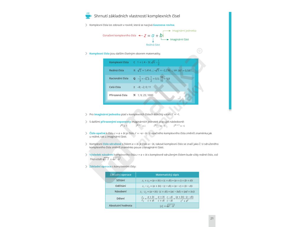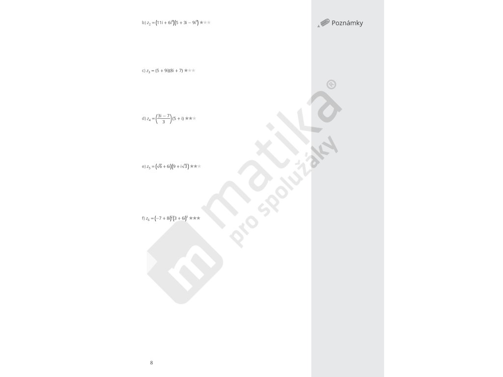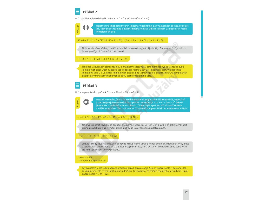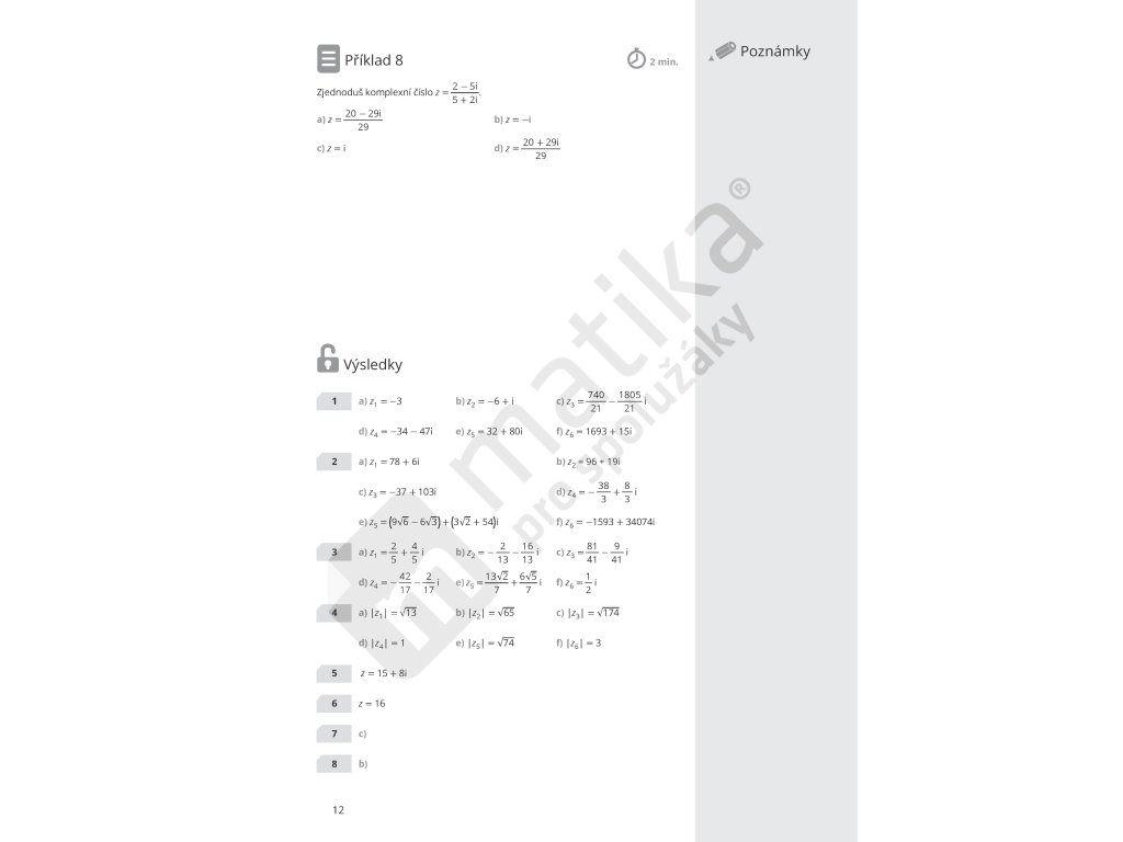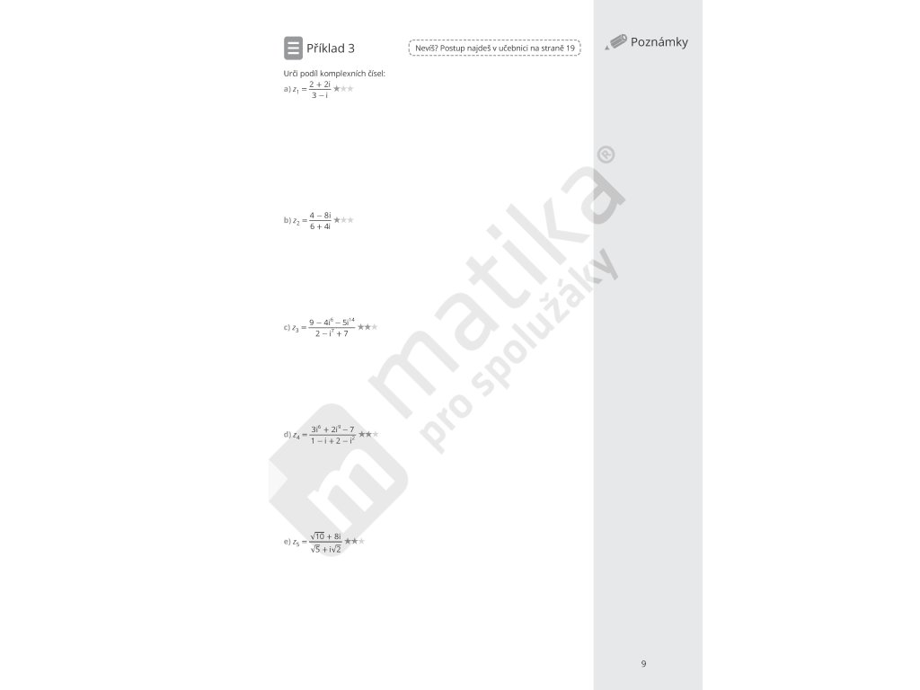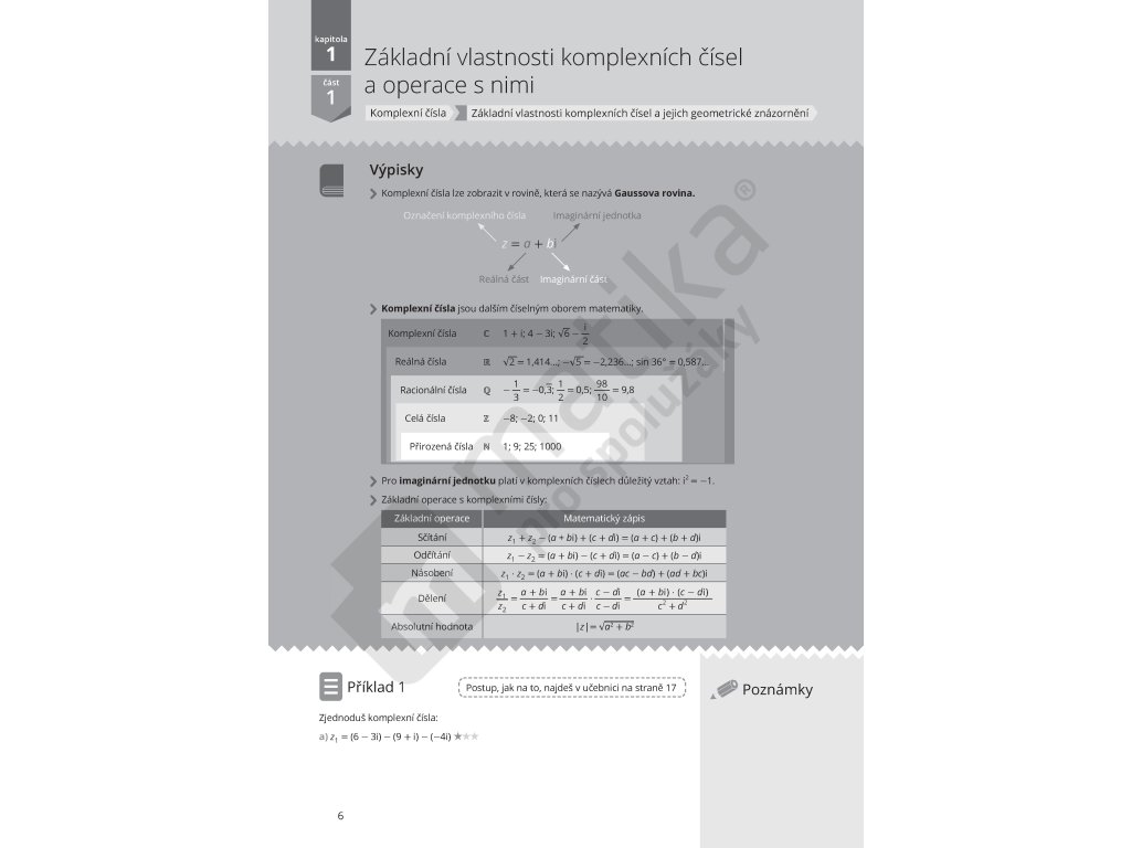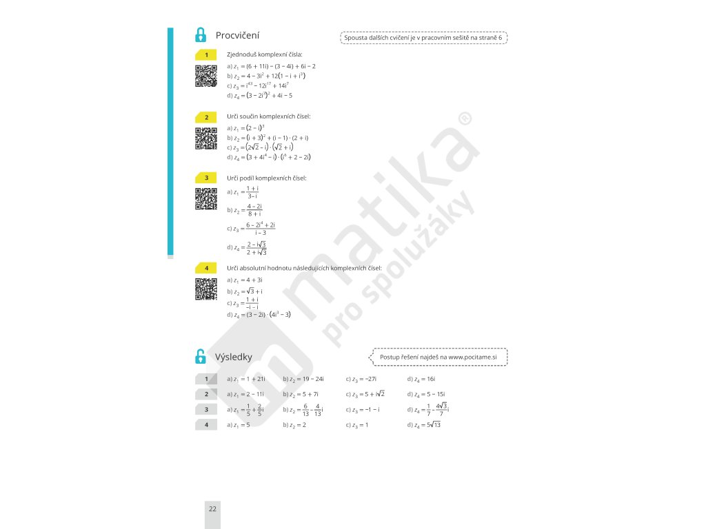 Pracovní sešit je určen pro studenty 4. ročníku středních škol a je úzce provázán s učebnicí Komplexní čísla. Učebnice vám poskytuje všechny potřebné výklady a postupy, díky kterým budete schopni řešit příklady v pracovním sešitu. Příklady jsou řazeny vzestupně podle náročnosti. Máte tak jedinečnou možnost zlepšovat se a mapovat svůj postup zároveň s postupem v pracovním sešitu. Každá kapitola obsahuje krátké výpisky, které vám připomenou to nejdůležitější, co budete při počítání potřebovat. Na konci kapitoly pak najdete výsledky jednotlivých příkladů, nemusíte tak složitě listovat v rozsáhlém rejstříku na konci knihy, ale jednoduše si ověříte správnosti výsledku o pár stránek dále.